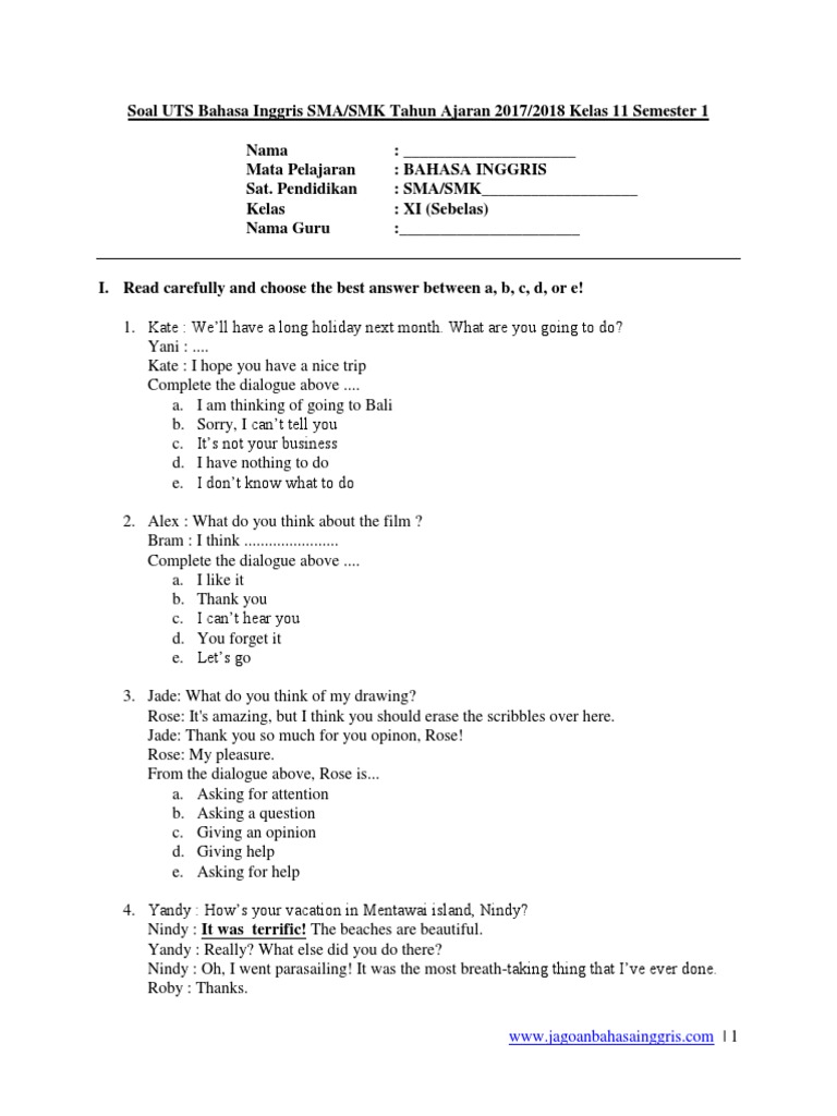 Soal bahasa inggris kelas 11 semester 1 tentang opinion. We did not find results for: Maybe you would like to learn more about one of these? Check spelling or type a new query.