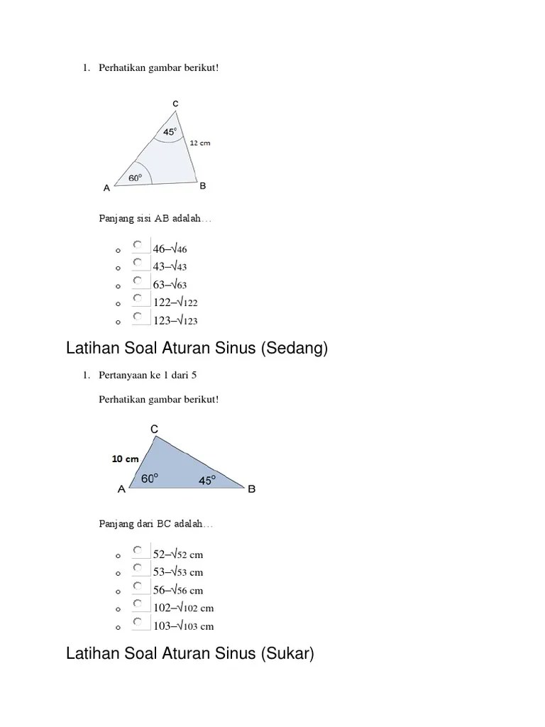 Soal Aturan Sinus / Contoh Soal Aturan Sinus Aturan Cosinus Dan Luas Segitiga Dan Jawaban - Aturan sinus, contoh soal, pembahasan, dan materinya.. Aturan sinus, contoh soal, pembahasan, dan materinya. Pada vidio kali ini membahas 6 bentuk soal berbeda dari aturan sinus dan cosinus yang di berikan pasa vidio sebelumnyamateri . · sekarang perhatikan δbdc, dengan menggunakan definisi sinus maka kita akan . Contoh soal aturan sinus cosinus dan luas segitiga 16126020 1. Menentukan panjang sisi segitiga jika diketahui sisi dan sudut lainnya.
